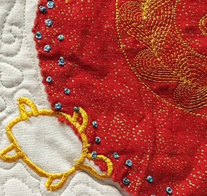 #AltTxt for banner pic: a tiny patch of a quilted square - with yellow stitching on cream and red fabric - made in 2020 for the https://quilt.femedtech.net/